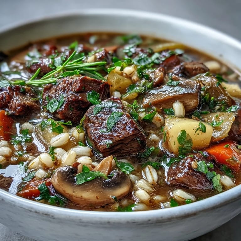 Pin it There's something about the sound of beef sizzling in a hot pot that signals the start of something real and nourishing. My neighbor stopped by one October afternoon, and I had this soup simmering—the kitchen was warm, steamy, and smelled like earth and broth, and she just lingered by the stove asking questions. That's when I realized this wasn't just a weeknight dinner; it was the kind of soup that makes people want to stay, to talk, to eat slowly. The barley adds a nutty substance that feels almost whole-grain honest, and the mushrooms give it this deep, umami backbone that beef alone could never achieve.