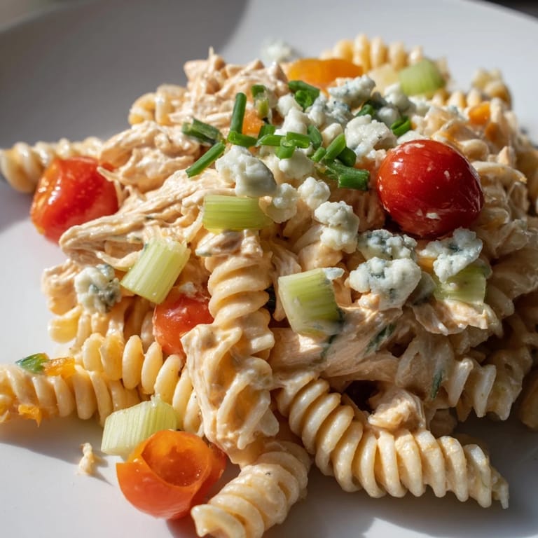 Use less buffalo sauce or dilute it with a bit of ranch dressing. You can also substitute mild hot sauce or omit it entirely for a creamy pasta salad with just the chicken and vegetables.